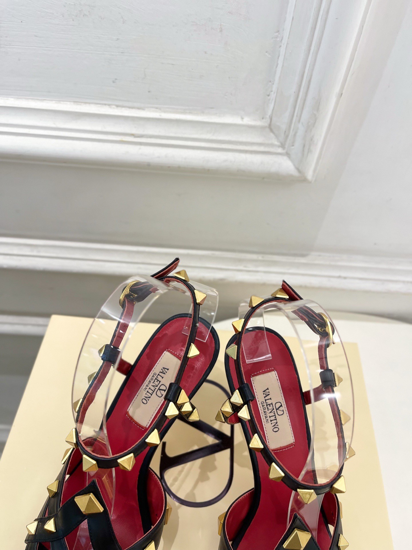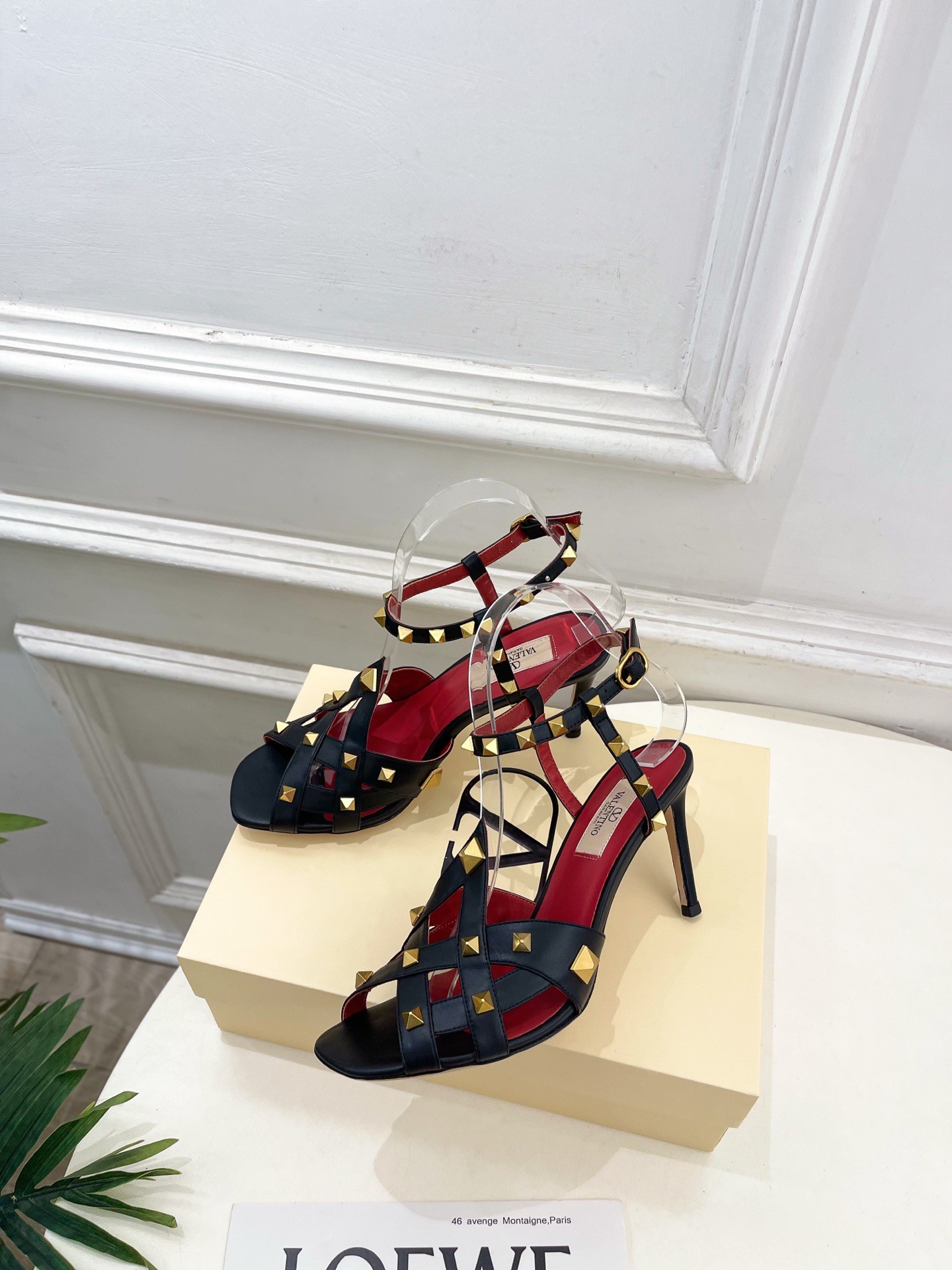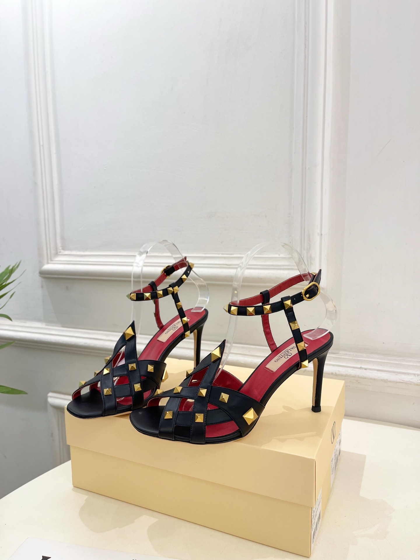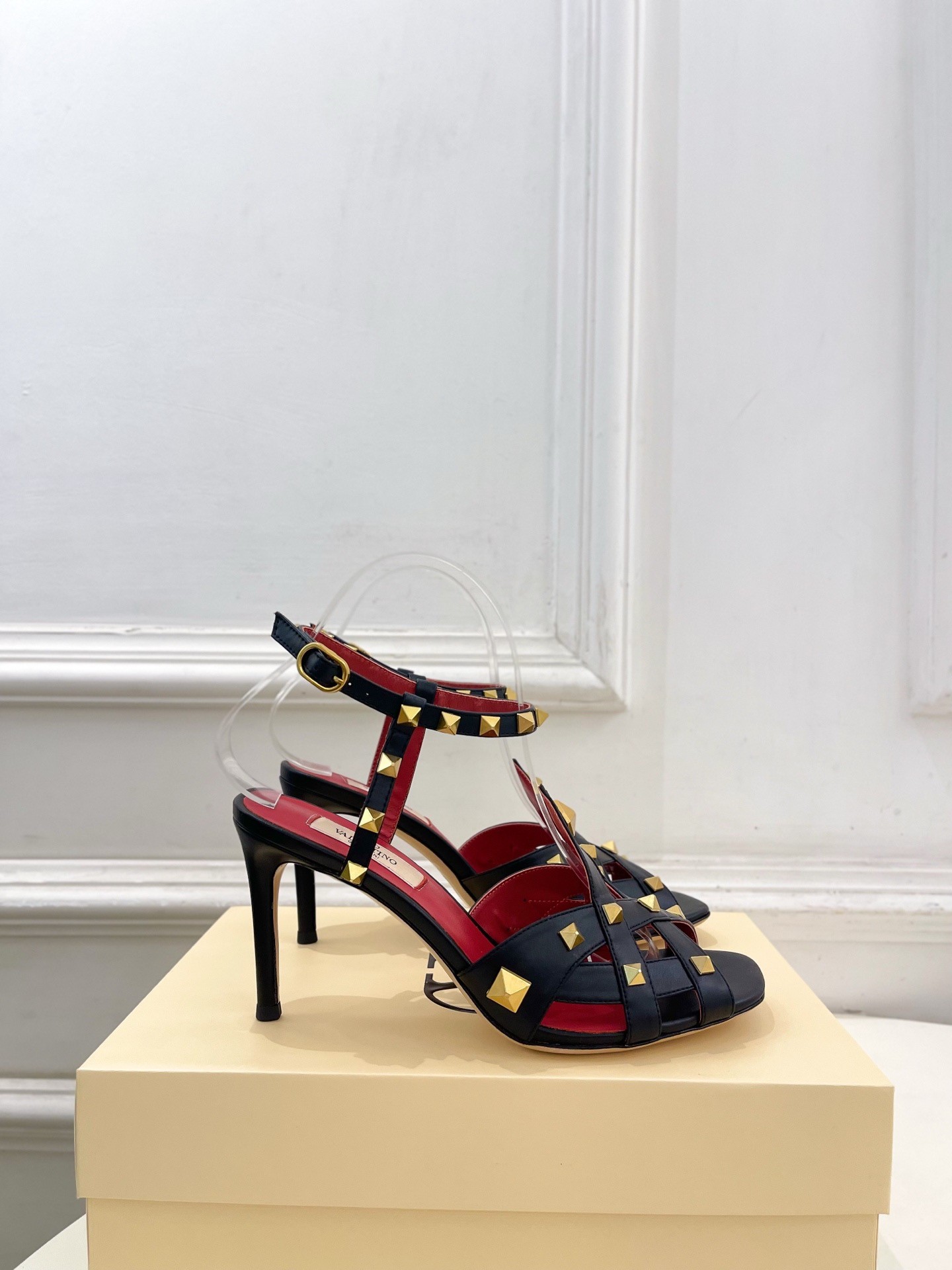 - Kidskin- Studs with antique-effect brass finish - Adjustable strap with buckle- Calfskin sole- Heel height: 100 mmComes with Valentino Garavani box, dust bag and authencity card.