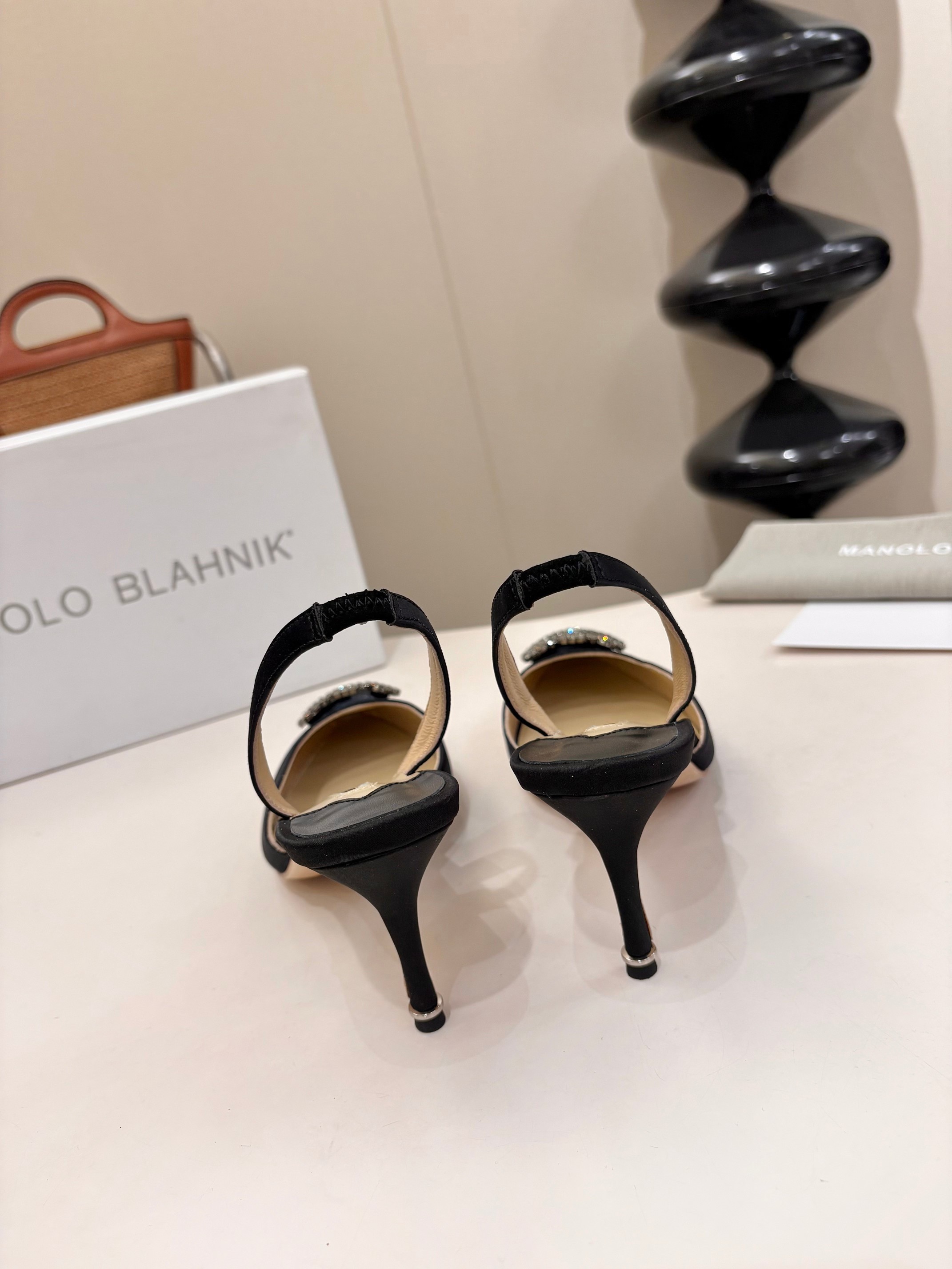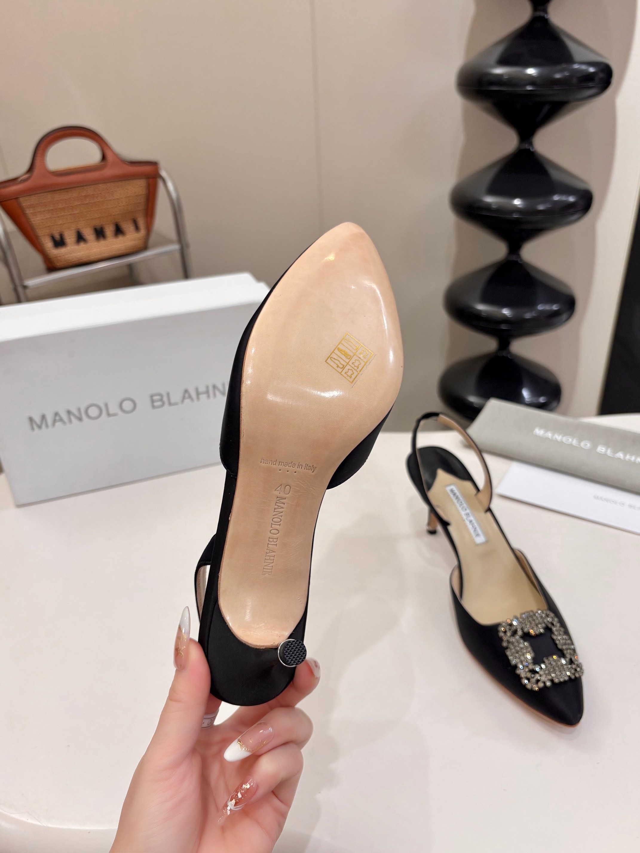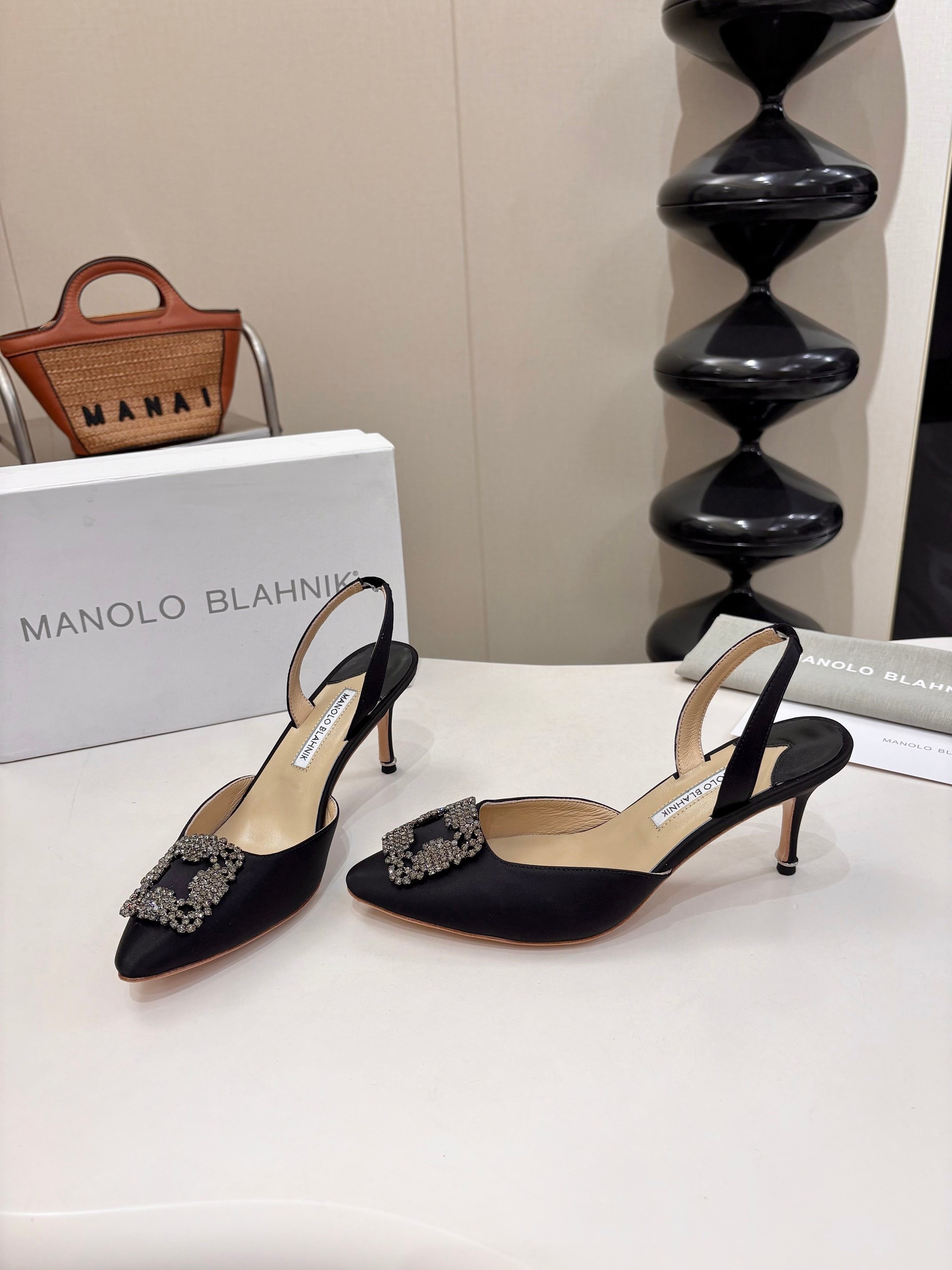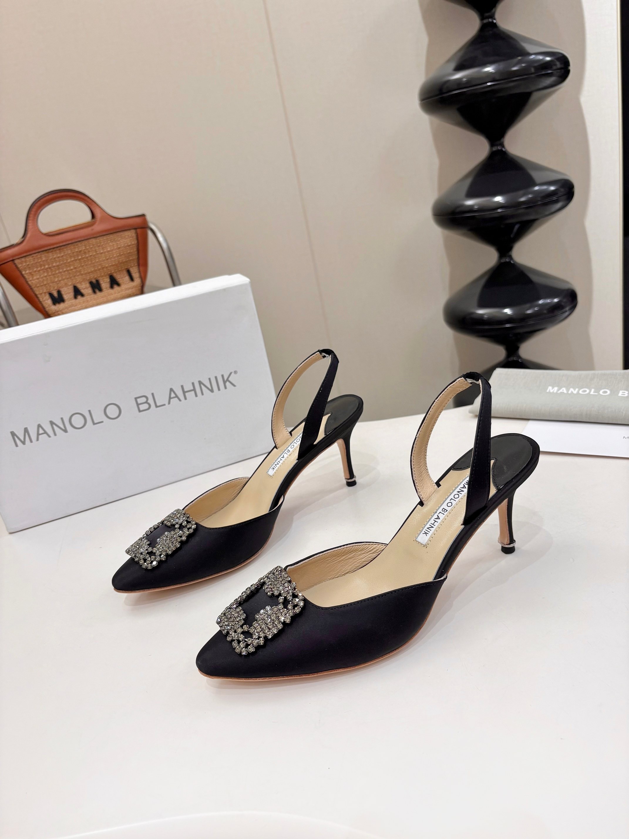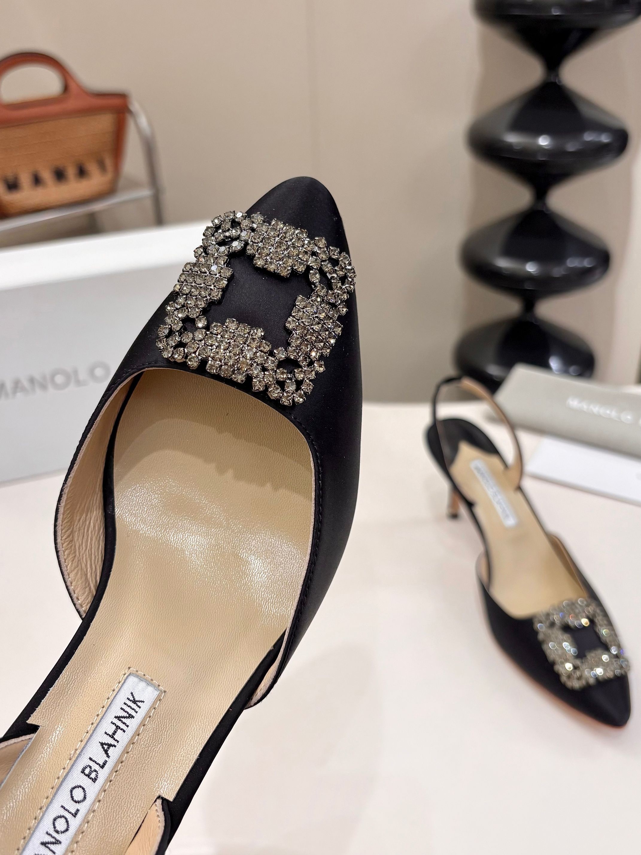 - Satin- Square crystal buckle- Calfskin sole- Lambskin lining- Heel measures 70 mmCome with Manolo Blahnik dust bag, box and certificate card.