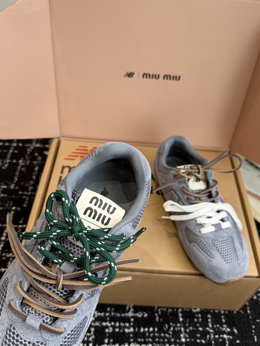The New Balance X Miu Miu collection is inspired by sportswear, combining style and performance. The iconic 530 SL sneakers are reinterpreted in a new tonal suede and mesh version that combines the casual detail of double laces and sophisticated, elegant finishes.