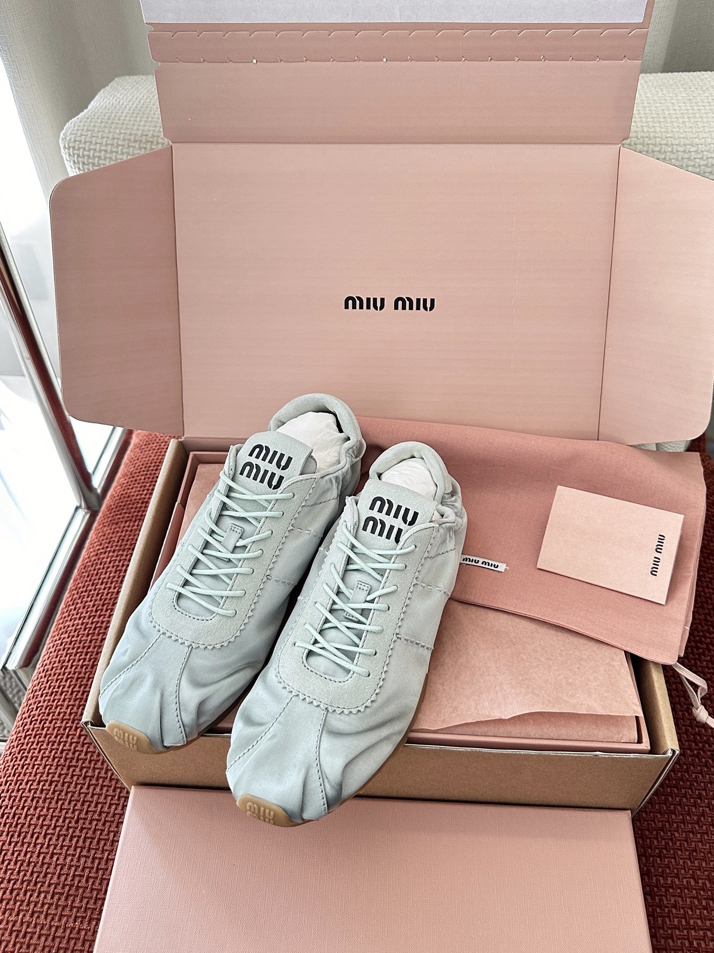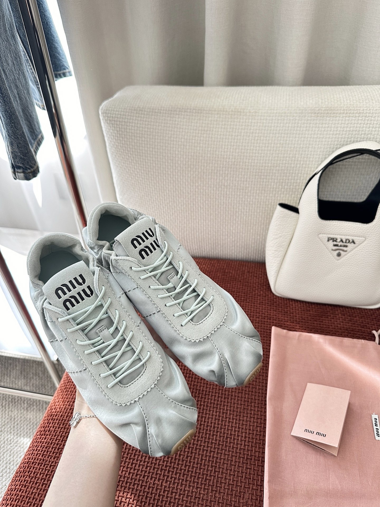 Showcasing a refined color palette and distinctive details, these Plume sneakers offer a modern twist on the iconic ballerina, capturing Miu Miu’s experimental spirit. Crafted in Satin, with a sleek, ultra-light design, they feature a rubber sole with perforated side lines, a removable insole, and a screen-printed logo on the tongue and heel.