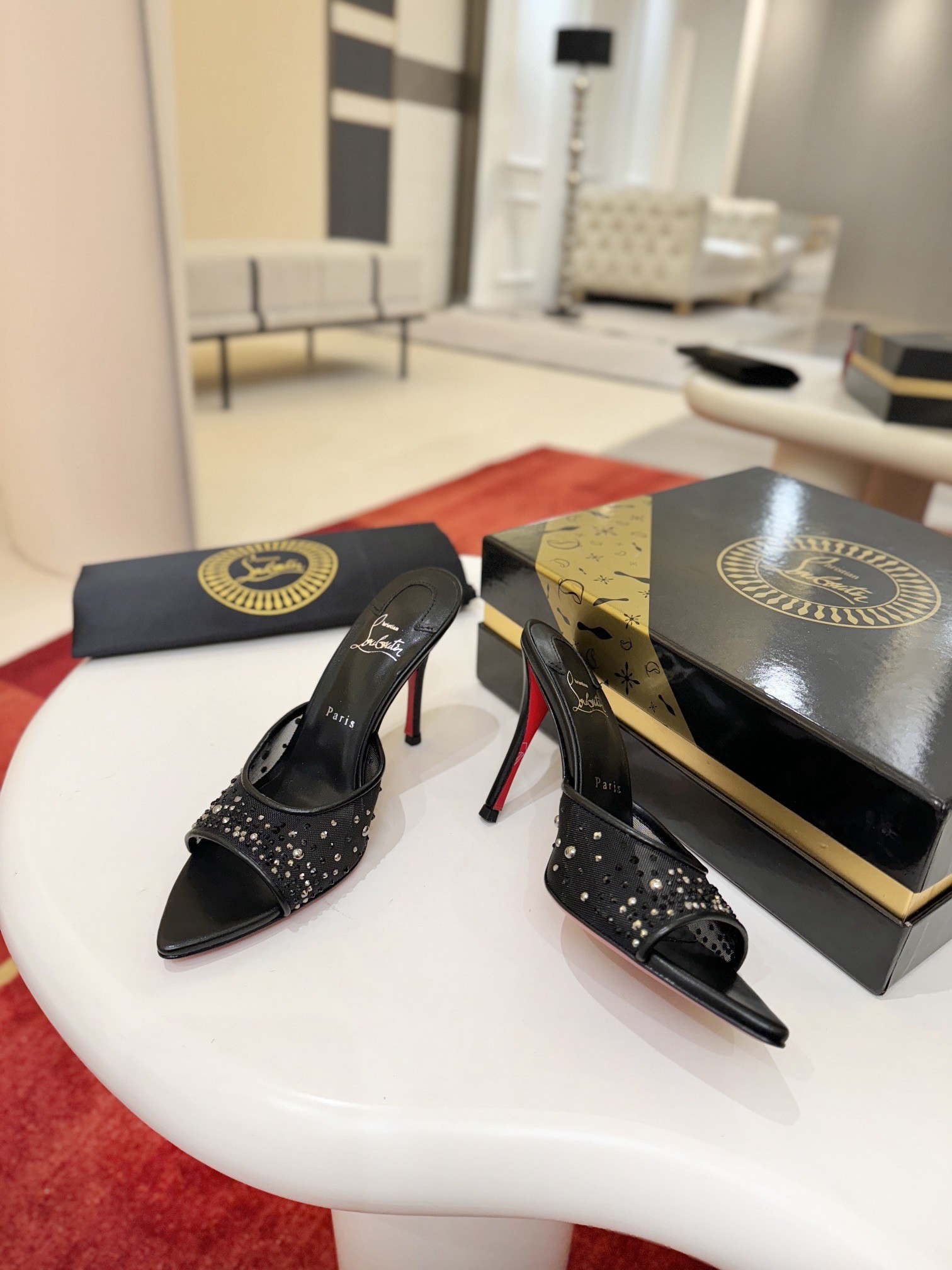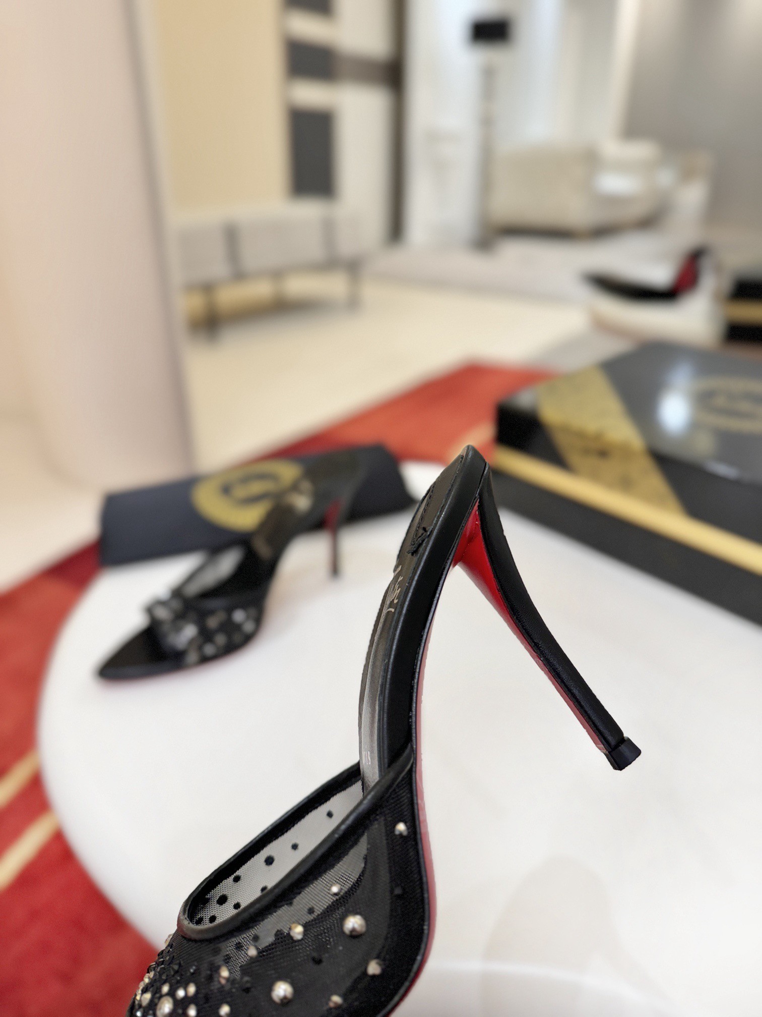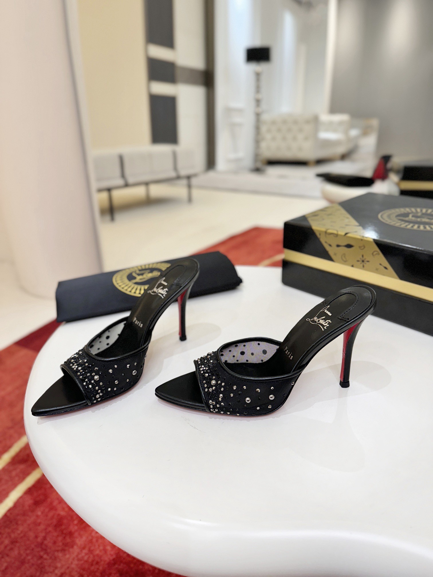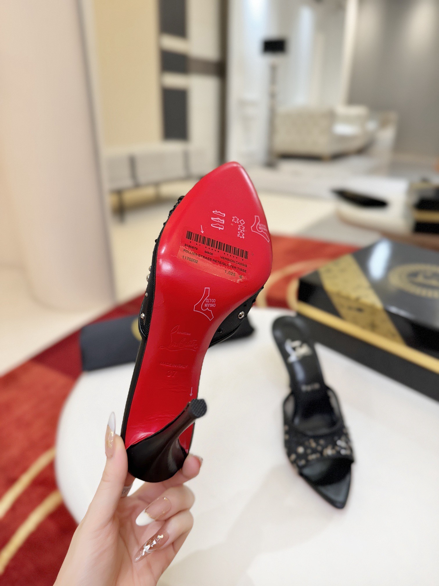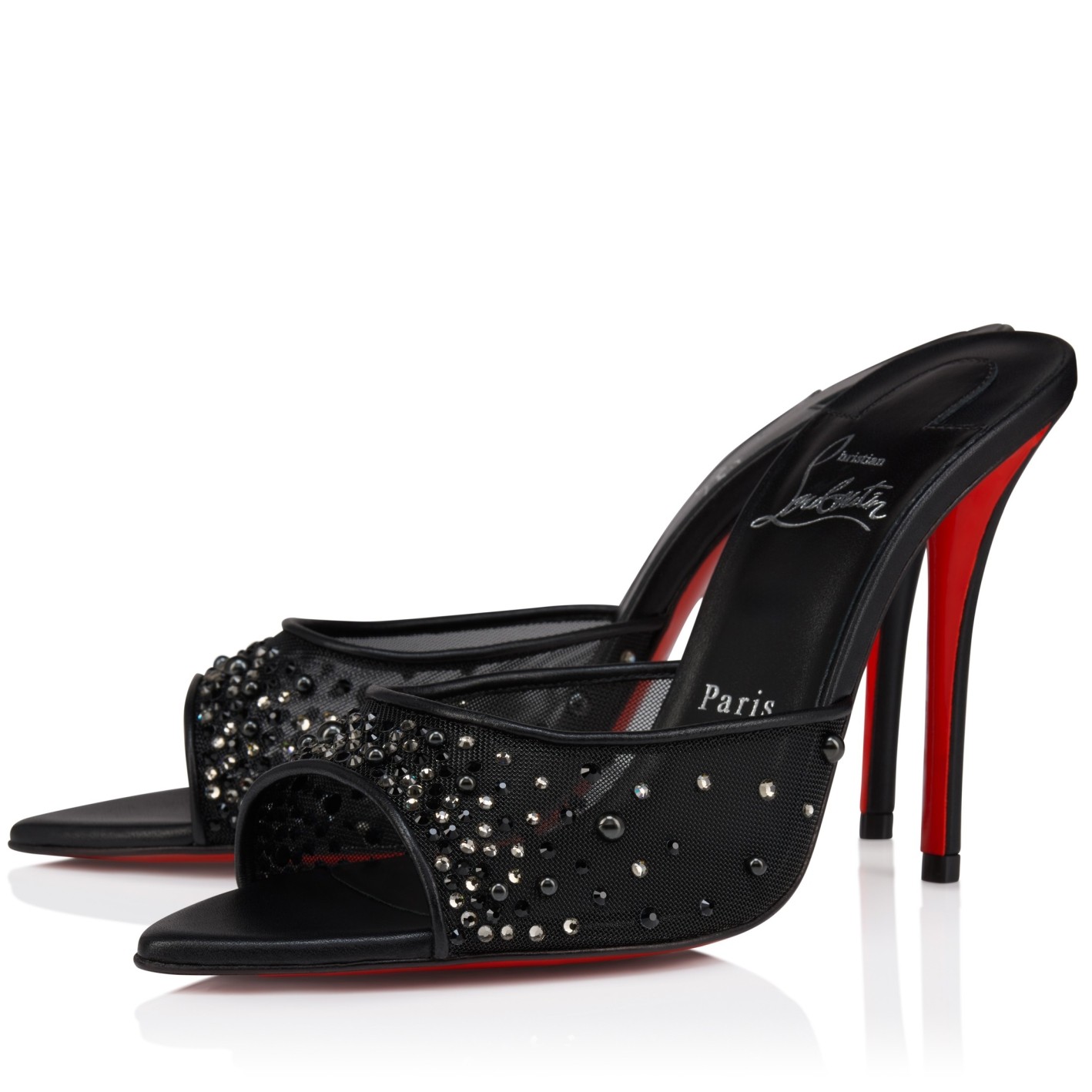 The Miss Z Mule sandal has a sophisticated, tapered silhouette. Set on a 100 mm stiletto heel that reveals the Loubi red of the iconic sole, and featuring a padded insole, this Maison Christian Louboutin shoe is crafted from mesh and lamb nappa leather. The mesh strap is adorned with hand-placed signature tonal strass and pearls, creating a gradient pattern rising from the toe to the heel.
